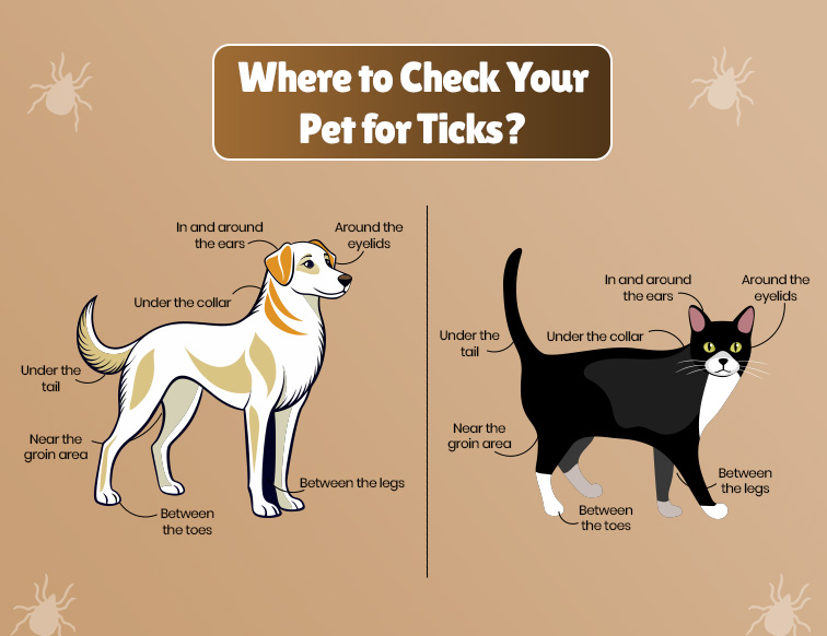 Ticks love to hide in dark, moist places where they can usually go unnoticed. These are the common areas on your dog or cat’s body where these blood-sucking parasites are often found:
